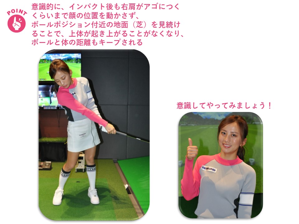 ①インパクトで上体を起き上がらせないためには打ったボールの行方が気になる⇒目標の方向へ顔が上がる⇒上体が起き上がる⇒トップ・・・という流れがミスを引き起こすわけですから、とにかく打ったボールを追おうとしないのが最善です。意識的に、インパクト後も右肩がアゴにつくくらいまで顔の位置を動かさず、ボールポジション付近の地面(芝)を見続けるようにしましょう。これにより上体が起き上がることがなくなり、ボールと体の距離もキープされます。