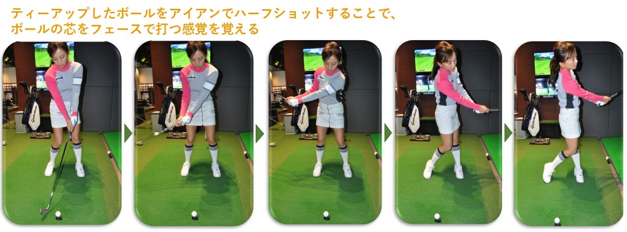 《Lesspn.1》ティーアップしたボールを打つティーアップしたボールをアイアンのハーフスイングで打つトレーニングです。ロフト角の大きいアイアンで打つことで、しっかりボールの芯をフェースで打つ感覚を覚え、ハーフスイングを繰り返すことでボールと体の距離感を一定に保つ効果があります。