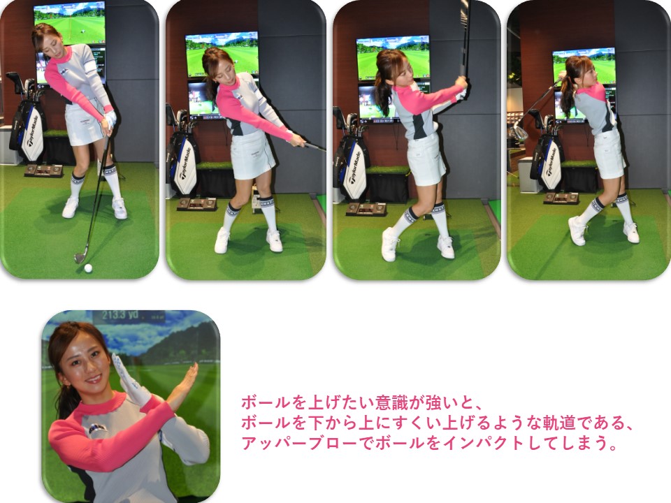 ところがボールを上げたいという意識が強いと、ボールを下から上にすくい上げるような軌道である、アッパーブローでボールをインパクトしてしまうことがあります。アッパーブローはクラブヘッドが最下点に達したあと、上昇している途中でボールにインパクトしますので、ボール上部にしかクラブヘッドが当たらずトップになるというミスです。