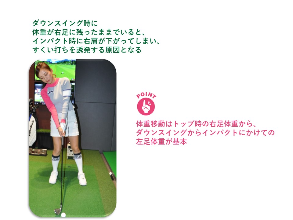 すくい打ちになりやすい原因に、体重移動ができていないというケースもあります。一連のスイングの流れのなかで、ダウンスイング時に体重が右足に残ったままでいるとインパクト時に右肩が下がってしまい、すくい打ちを誘発する原因となります。体重移動はトップ時の右足体重から、ダウンスイングからインパクトにかけての左足体重が基本。つまりインパクトの時点では左足に体重を移動させていかなくてはいけません。右足に体重を残したままインパクトを迎えるとすくい打ちになり、トップの原因になります。ダウンスイングでスムーズに体重を左足側に移すことが重要です。