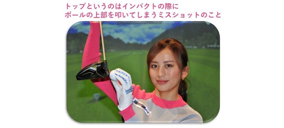 みなさん、こんにちは。江口紗代です。今回の誌上レッスンでは、地を這うように転がる「ゴロ」弾道で、距離を出せなかったり、逆に思った以上に遠くへボールが転がってしまったりとなにかと厄介なミスショットである「トップ」について解説させていただきます。練習場では思いどおりの弾道を描くナイスショットを連発できるのに、肝心のコースではトップばかりでスコアにならない。そんな経験は誰しも一度や二度はあるのではないでしょうか。パーオンを狙ったショットがトップしてグリーンに届かない、グリーン周りのアプローチがトップして反対側のバンカーへ、はたまた池越えショットでトップして池ポチャ・・・考えただけでも背筋が凍りそうなミスショットですよね。(笑)トップが出るには当然、スイングメカニズムの欠点があるはずです。今回のレッスンではスイングメカニズムの欠点を解明して思わぬ大けがにつながってしまう「トップ」を防ぎ、アイアンを自在に操るワンランク上のゴルファーを目指しましょう!