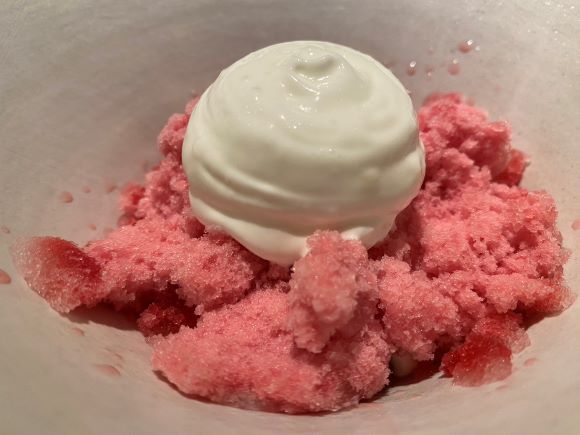 バラと桃のソルベの下にはライチがあり、上にはチーズクリームが乗っています。