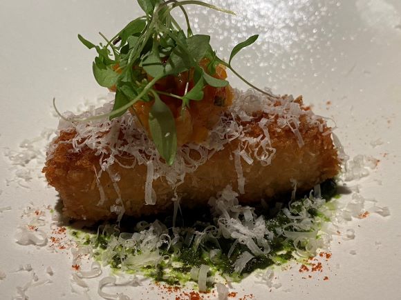 豚足とひよこ豆を使ったコロッケで、上には発酵トマトを使ったカポナータが盛り付けられ、