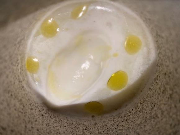 トマトを凍らせて液体と固体に分け、その液体を北海道の牛乳から作ったミルクジェラートにかけられた一品です。