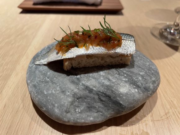 こはだの稚魚をフォカッチャの上に乗せ、玉ねぎソースがかかった一皿。