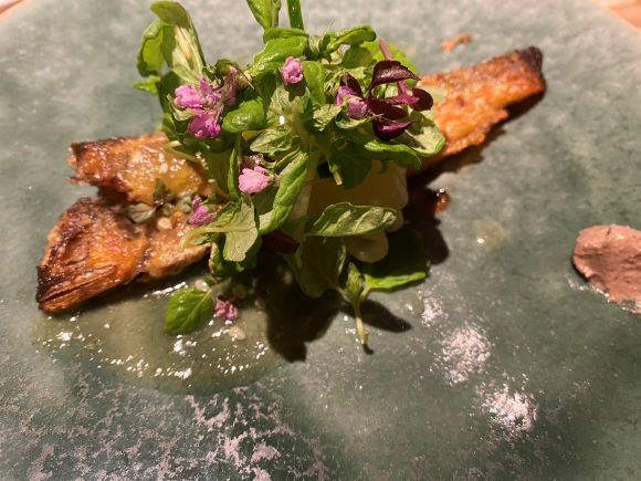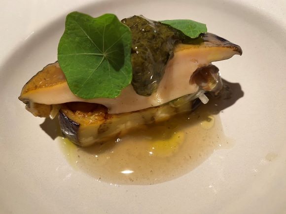 鮎を低温調理(100度近い温度で6時間以上調理)し、凝縮したメロンソースがかかっており、