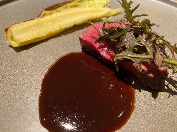 牛コツ、牛スジからとったソースがかかっており、ご覧のようにとてもきれいな焼き色のお肉で