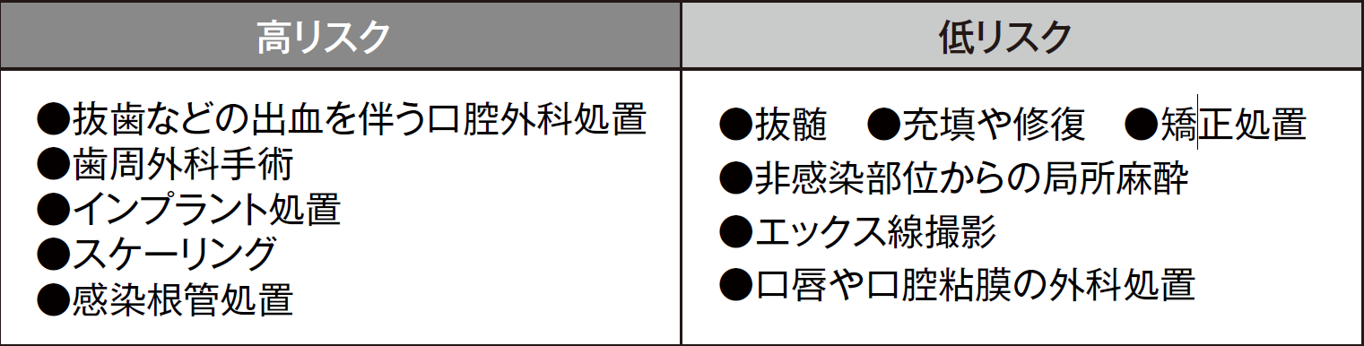 感染性心内膜炎は、主に2つの条件が満たされると発症のリスクが上がります。まず1つ目は、前述のように、口腔レンサ球菌が血管内に侵入することです。【表1】に示すような観血的な歯科処置を行うと、出血部位から菌が侵入することになります。逆を言えば、非観血的な歯科処置では、菌の血管内への侵入は考えにくいということになります。2つ目は、内皮傷害を生じる基礎となる心臓病を有しているということです。しかし、全ての心疾患で内皮傷害を生じるということでもありません。心臓の専門の先生にお尋ねになると、患者さんの有する心臓病における感染性心内膜炎の発症リスクについて教えていただけることと思います。