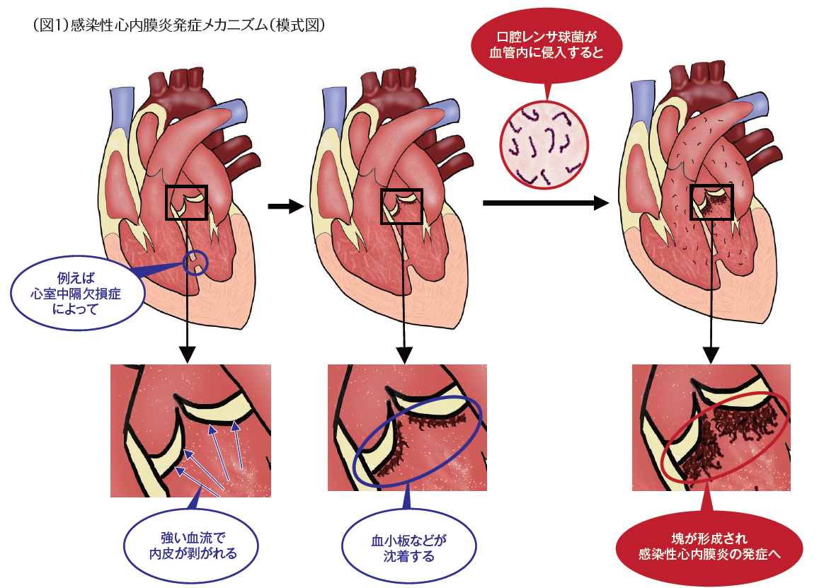 感染性心内膜炎は、心臓の弁膜や心内膜に細菌や血小板などが塊を形成して生じる疾患です。図1に、感染性心内膜炎の発症メカニズムの模式図を示します。まず、先天性心疾患などが原因になって不規則な血流が生じ、強く圧力がかかる箇所の弁膜や心内膜の内皮が剥がれてしまい、血小板などの塊が形成されます。歯科治療などで出血が生じた際には、口腔レンサ球菌が血管内に侵入し、その塊に加わってしまうことがあります。健康な人であれば、たとえ血管内に菌が侵入しても免疫の働きですぐに排除されるので心配ありません。ただ、塊が形成されている場合には、そこに菌が引っ掛かって増殖してしまいます。この塊が大きくなってくると様々な症状が生じてくるのですが、その1つが発熱などのいわゆる感染症状で、微熱がだらだらと長期間続くようなイメージです。その他には、塊が剥がれて血管の中を移動して詰まらせしてしまうことで、各種臓器の梗塞状態を引き起こすことがあります。また、塊のせいで心臓弁がうまく働かなくなることで、心不全につながったりします。