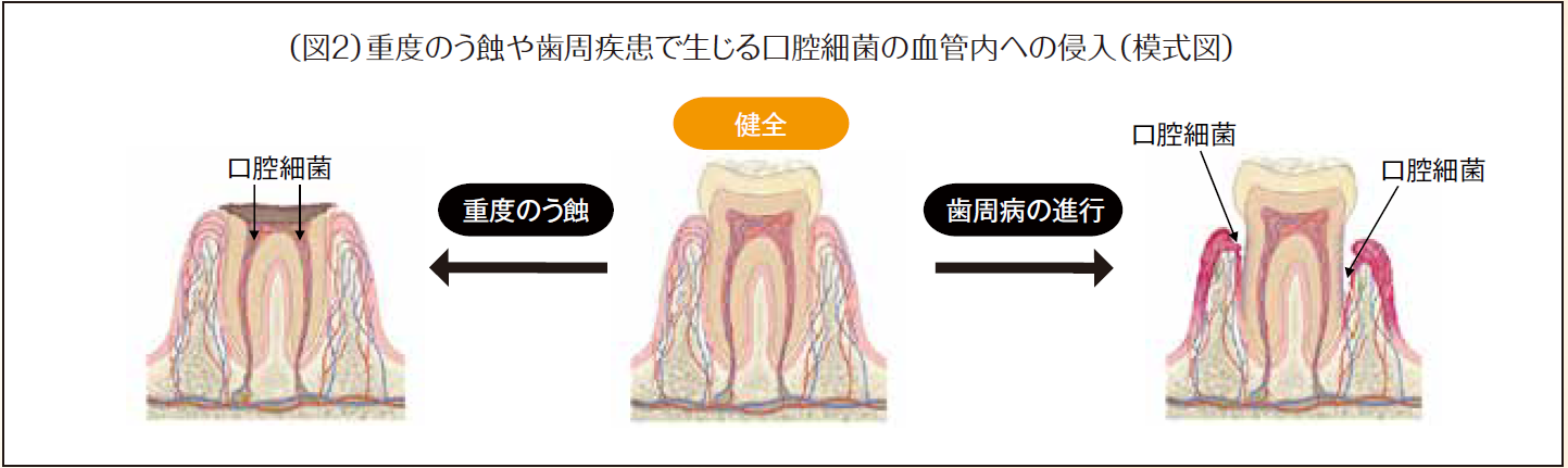 抜歯などの出血を伴う処置が行われると、口腔レンサ球菌が血管内に侵入してしまうことはイメージしやすいかと思います。一方で、歯髄腔にまで及ぶう蝕が放置されていれば、そこに存在する毛細血管を通じて、微量ですが持続的に菌が血管内を巡ることになります(図2)。