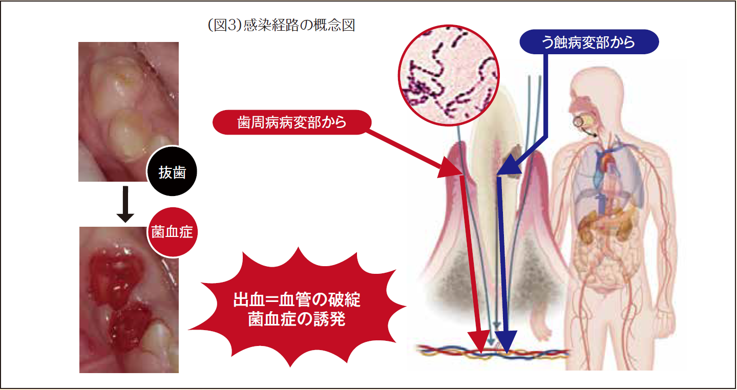 また、歯周疾患が進行すると、歯周ポケット内部に潰瘍面が形成され毛細血管が露出します。「軽く触っただけで出血する箇所」というように表現すると、より具体的で分かりやすいかもしれません。このように重度のう蝕や歯周疾患を放置していると、口腔レンサ球菌が血管内に入ってしまう状況であることも理解してもらう必要があります。(図3)