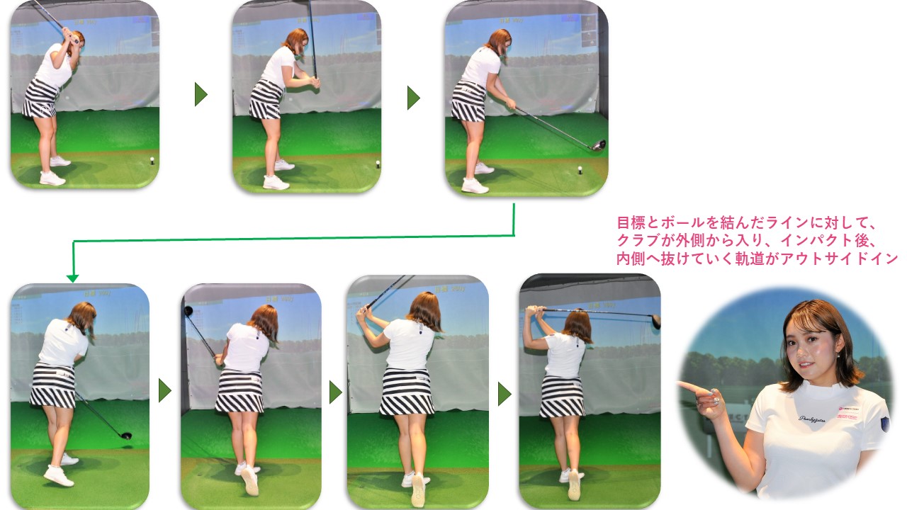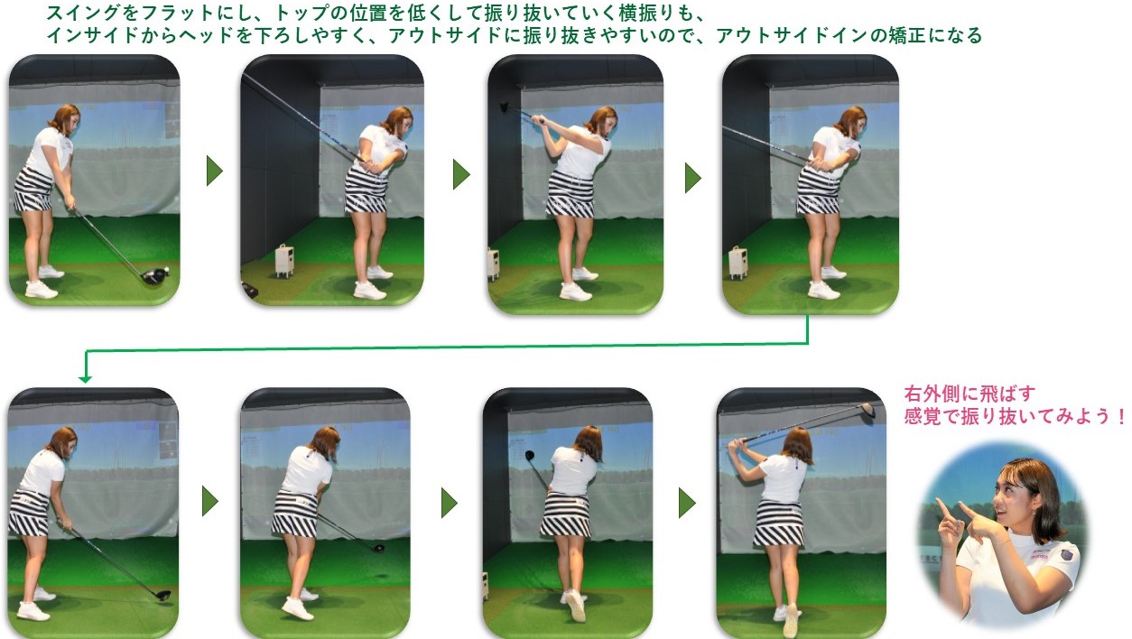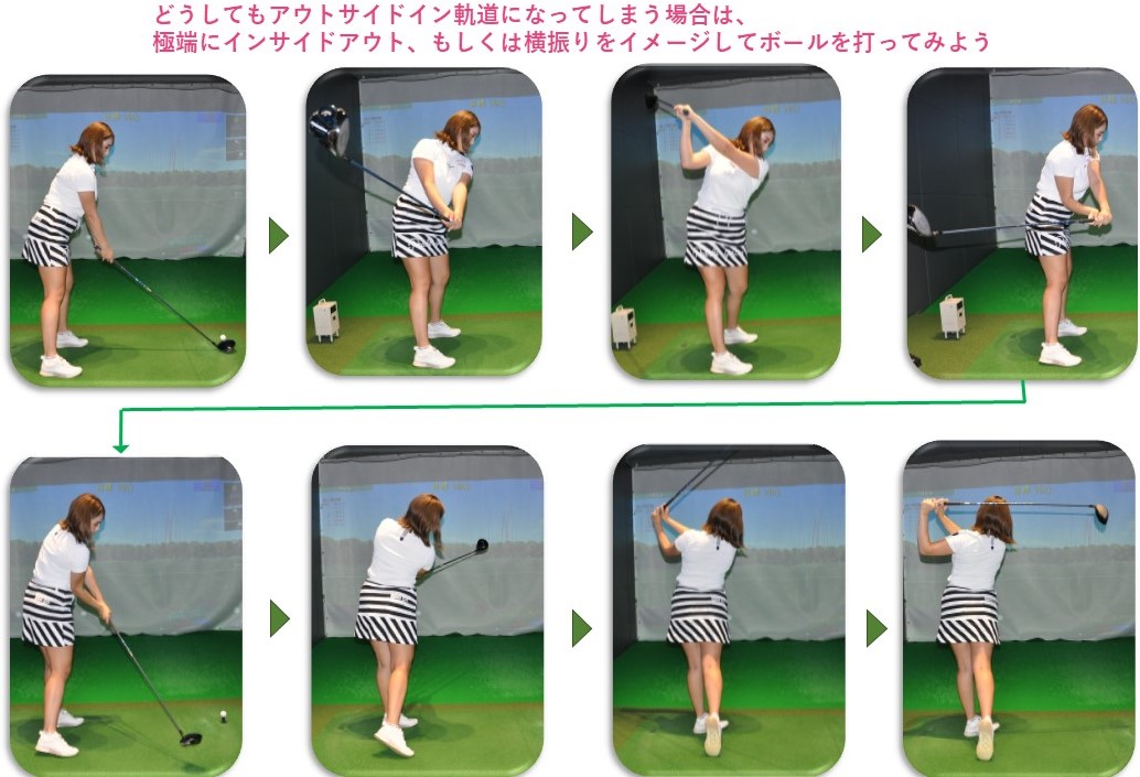 それでも、アウトサイドイン軌道になってしまう・・・という場合は、極端にインサイドアウト、もしくは横振りをイメージしてボールを打ってみましょう。インサイドアウト軌道は、ダウンスイングで身体の内側(手前側)からクラブヘッドが入り、外側に抜けていくスイング。アウトサイドイン軌道とは真逆の軌道ということになります。極端にこの軌道でボールを打ち、ターゲットよりもかなり右外側にボールを飛ばすくらいの感覚で振り抜いていきます。かなり強引な矯正法ではありますが、これも有効な手段です。またインサイドアウト軌道と同系統ではあるのですが、スイングをフラットにし、トップの位置を低くして振り抜いていく、いわゆる横振りもインサイドからヘッドを下ろしやすく、アウトサイドに振り抜きやすいので、アウトサイドインの矯正になります。