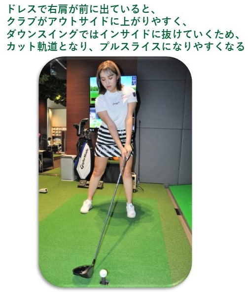 みなさん、こんにちは。西田茉楓です。今回の誌上レッスンでは、ゴルファーの大半がまず悩まされるミスショット、スライスについて解説いたします。ご存じのようにスライスとは、インパクトしたボールが右利きの場合は右(左利きの場合は左)に大きくカーブし、最悪の場合OBの可能性を秘めた嫌なミスショットです。ただスライスと一口に言いましても、インパクトした時点で右に飛び出し、さらに右に曲がっていく「プッシュスライス」、一旦左へ飛び出し、徐々に右に戻る「プルスライス」と大きく2種類のスライスが存在します。同じスライスの括りでも、それぞれ症状が違いますし、対処法も違いしますので、今回は「プッシュスライス」と「プルスライス」に分けて解説していきたいと思います。