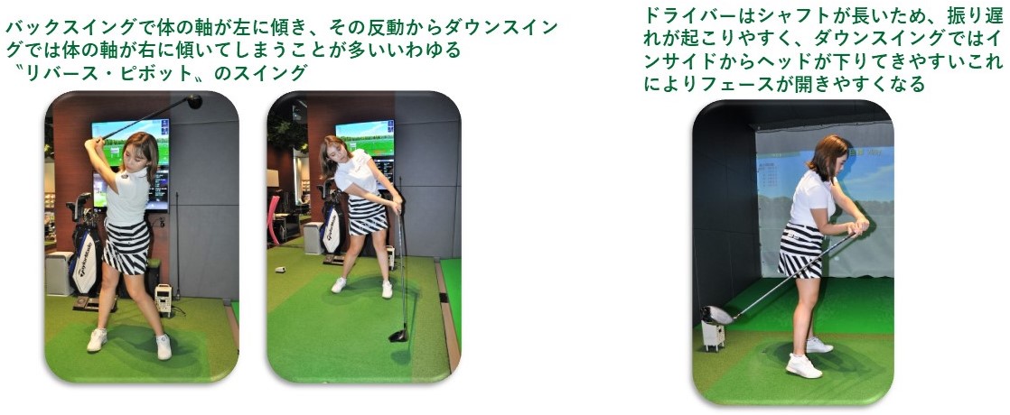 プッシュスライスが出やすい方の多くは、バックスイングで体の軸が左に傾き、その反動からダウンスイングでは体の軸が右に傾いてしまう傾向が見られます。トップでは左足体重、インパクトは右足体重となるいわゆる〝リバース・ピボット〞のスイングです。プッシュスライスを根本的に修正するにはインサイドから下りてくるダウンスイングを修正するだけではなく、スイング軸のブレから修正しなければいけません。