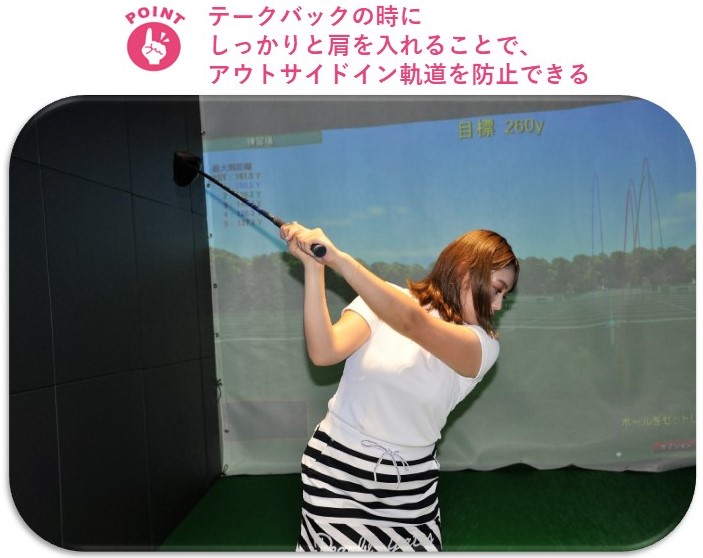 またアウトサイドイン軌道の修正として有効なのが、肩の捻転です。テークバックの時にしっかりと肩を入れることで、アウトサイドイン軌道を防止できます。ゴルフのスイングは両肩を結んだラインが、飛球線に対して度まで捻転が達していないと浅いと言われています。捻転がしっかりできていれば、クラブがアウトサイドから下りることなく、正しいスイングプレーンでボールを捉えることができるようになります。