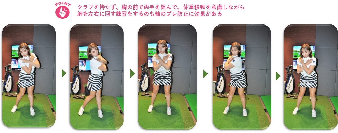 スイング軸のブレの修正におすすめしたいのが、スタンス幅を小さくしてハーフスイングでボールを打つ練習です。背骨にある軸をイメージして構え、その軸が左右に流れないよう、コンパクトな振り幅でスイングします。振り幅としてはバックスイングで右腰くらいの高さ、そこからダウンスイングに入り、フォローは左胸の高さくらいに収めます。これくらいの小さな幅のスイングで練習を重ね、体に覚え込ませることで、リバース・ピボットを矯正できるようになります。ただし、スタンス幅を小さくしたとしても、足の動きは止めたままにせず、体重移動は意識しましょう。両足の動きを止めたままにして腕だけを使ってクラブを振ると、いくらコンパクトなスイングでもボールの飛ぶ方向がバラつきやすくなります。たまにクラブを持たず、胸の前で両手を組んで、体重移動を意識しながら胸を左右に回す練習をするのも軸のブレ防止に効果があります。コンパクトな振り幅で軸のブレを矯正できれば、あとはスタンス幅を徐々に広げ、振り幅も大きくしていきます。軸がブレず、体重移動や体の回転がスムーズにできるスタンス幅を見つけましょう。