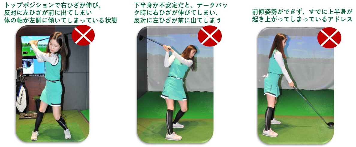 前傾姿勢がキープできないとスイング軸にブレが生じます。その原因は下半身が不安定だから。下半身が不安定だと、どうしてもテークバック時に右ひざが伸びてしまい、反対に左ひざが前に出てしまいます。こうなると左肩まで下がってしまい、上半身が起き上がったスイングとなります。そこで修正におすすめしたいのが、両ひざはアドレス時の角度をキープし、しっかり踏みしめ、力を込めること。下半身を安定させることで、前傾がキープしやすくなります。