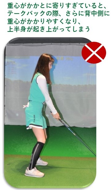 アドレス時に重心がかかと寄りになりすぎていると、上半身が起きてしまう原因になります。重心がかかとに寄りすぎていると、テークバックの際、さらに背中側に重心がかかりやすくなり、上半身が起き上がってしまいます。アドレス時の重心位置は、真下から“少し”かかと寄り。アドレス時の重心位置をキープしながら一連のスイングを行いましょう。