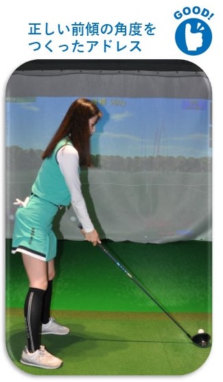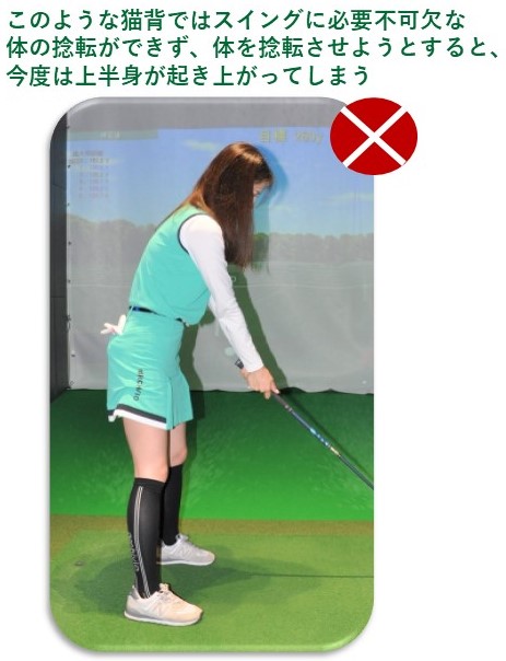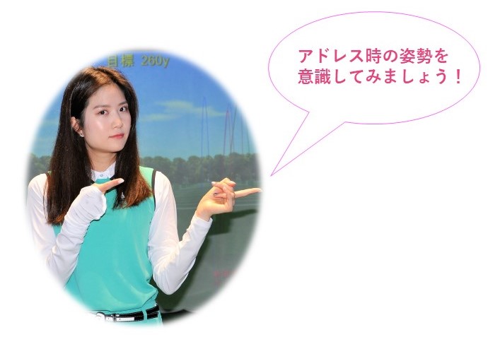 アドレス時に背中が伸びず、丸まった猫背になっている方も多いですね。実は猫背も上半身が起き上がる原因になってしまいます。猫背のままではスイングに必要不可欠な体の捻転ができません。体を捻転させようとすると、今度は上半身が起き上がってしまうのです。アドレスの前傾は両足の付け根から上半身を前に倒すように構えます。構えた際は猫背にならず、背中が真っ直ぐ、直線状になっているイメージを持ちましょう。