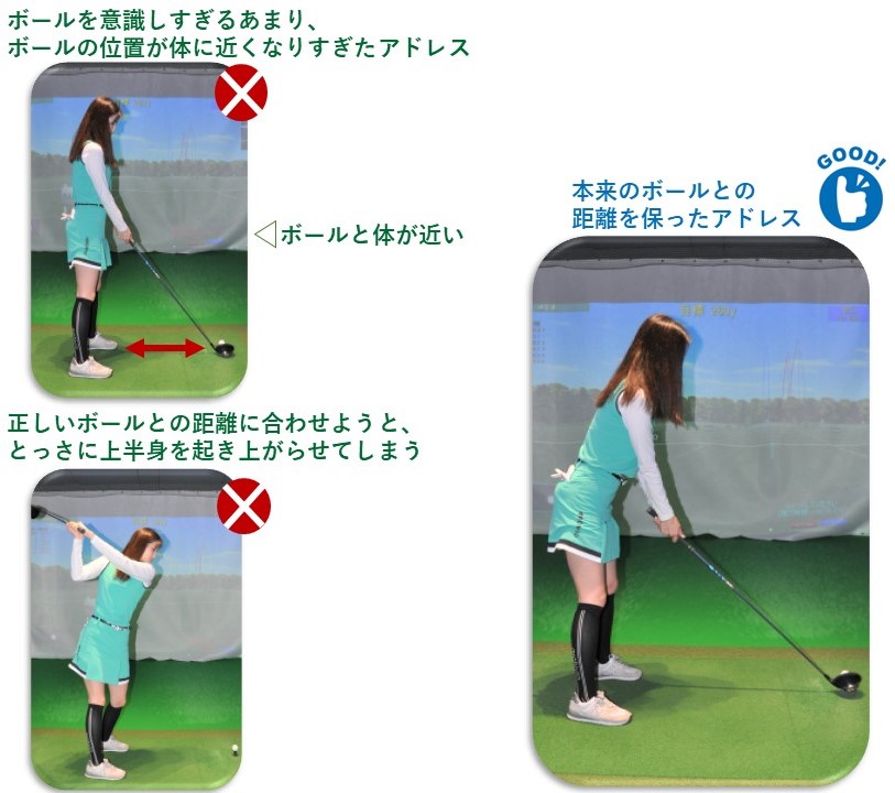ボールを意識しすぎるあまり、アドレス時のボールの位置が体に近くなりすぎるケース。特に初心者に多い原因です。テークバック時にボールとの距離が近すぎると、このままでは窮屈になってしまうと頭が判断します。それを避けるためにボールとの距離を修正しようとして上半身をとっさに起き上がらせるエラーです。上半身が起き上がることで目の高さの位置も変わりますから、上手く距離を合わせられず、チョロになるケースが多いわけです。アドレスでのボールの位置は常に一定に保ちましょう。