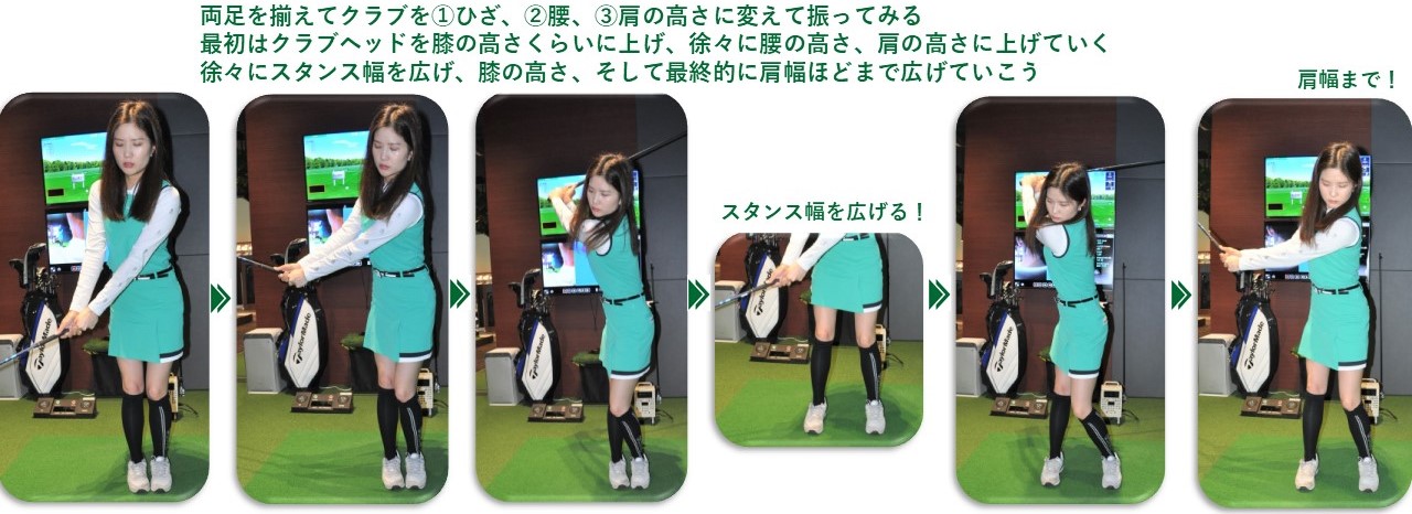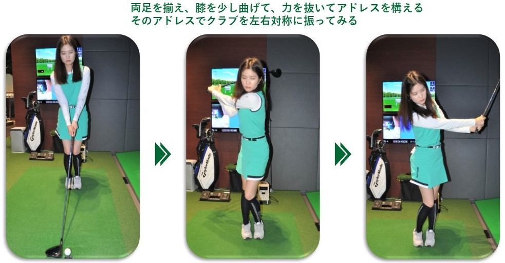 アドレスで両足を揃え、膝を少し曲げて、力を抜いて構えましょう。このアドレスができれば、次に同じスイングの大きさでテークバック~フォローを繰り返します。振り幅は、まず膝くらいの高さから。慣れてくれば徐々にその幅を腰の高さ、肩の高さまで大きくしていきます。足を揃えてスイングすることで下半身を安定させ、特に左ひざが前に出て右ひざが伸び切って、上半身が起き上がるエラーを防ぐことができます。