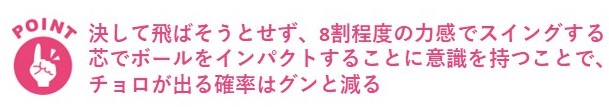 脱力だけでなく、振り幅も肩から肩くらいの大きさに収めてください。体の捻転を活かし、しっかりと芯でボールを捕らえると、このスイングでも想像以上に飛距離は出せるはずです。チョロが出る確率もグンと下がりますし、ボールのブレも減少します。ぜひ試してみてください。
