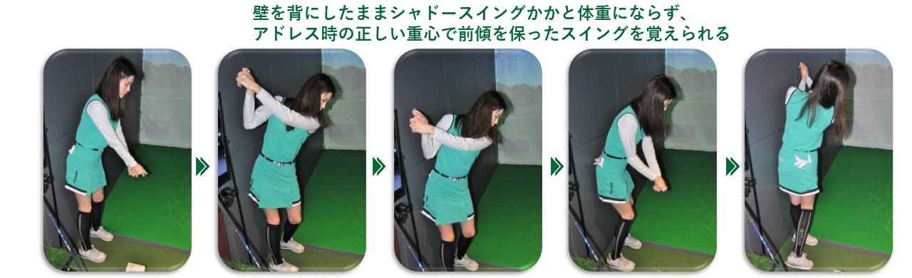 次にクラブがなくても自宅でできる練習方法です。まず、壁を背にして立ち、アドレスを作ります。お尻を壁につけたままシャドースイングをしてみてください。後方に壁があることで、かかと体重にならず、アドレス時の正しい重心で前傾を保ったスイングを覚えられます。