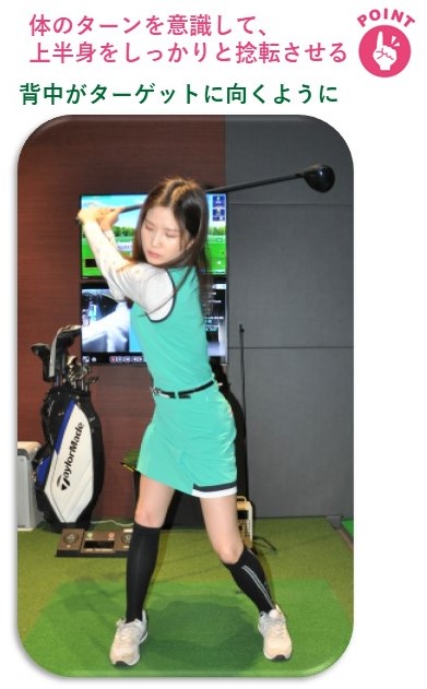 始動から腰の回転を使わず、手首や腕の力を使ってスイングする手打ちでは、体と腕の動きが同調しづらく、腕の動きでクラブを上げようとしてしまい、上半身が起き上がってしまいます。体のターンを意識して、上半身をしっかりと捻転させましょう。バックスイングでは背中がターゲット方向に向き、インパクトにかけては胸がターゲット方向を向くのが理想。腕は体のターンについてくるような動き。これなら上半身が起き上がるようなことはありません。