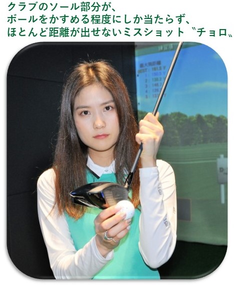 みなさん、こんにちは。松原果音です。今回の誌上レッスンでは、ボールがクラブヘッドのソール付近に当たってしまい、ほとんど距離が出ないミスショット〝チョロ〟について、特にドライバーショットを中心に改善方法を解説していきます。ティーショットの際、思い切り飛ばしてやろうとフルスイングしたのはいいものの、クラブヘッドがボールにかすっただけで、ほとんど前に飛ばなかった・・・こんな恥ずかしい経験は誰しも一度や二度はあるのではないでしょうか。ゴルフ練習場でのショット練習ではチョロなんて、まず出ませんよね。なのに、いざコースになると出てしまう。一口でいうと、コースならではのボールを遠くへ飛ばそうという「力み」がチョロを生んでいるのです。もちろん、力み以外にも要因はありますが、遠くへ飛ばそうという意識がこのミスショットにつながる主な要因と言えるでしょう。