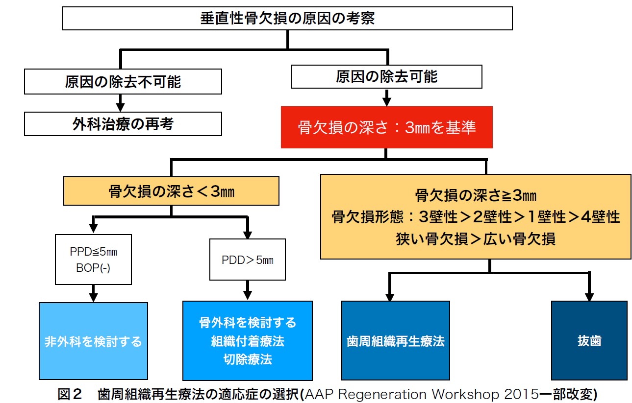 最近、メディアなどで再生治療の話題をよく目にするようになったと感じる。歯科界も例外ではなく、歯髄再生治療の実用化や世界初「歯生え薬」の治験など、多くの再生治療に関する研究が行われている。また、歯周組織再生療法(以下、再生療法)は、歯の付着器官を再生させ、失われた支持組織を回復することを目的としている治療法であり、古くから先人たちによって多くの研究開発が行われ、治療技術の進歩や材料開発など目覚ましいものがある。その予知性は高まりつつあり、多くの歯科医師が手掛けるようになったものの、今なお高度な治療技術であることには変わりない。そのため、多くの歯科医師にとって再生治療は特別な治療法と思われがちであるが、歯周外科処置の一手法であり、前稿で示した歯周外科処置の延長線上にある治療法である。組織付着療法や切除療法を実践することで、歯周ポケットの減少や除去が達成され、天然歯周囲の環境改善につながる訳だが、骨の不整形を認める歯周疾患の場合、骨切除を行い骨形態の改善を図ることで、場合によっては根分岐部の露出を招き、また歯根露出による術後の知覚過敏症状を引き起こす可能性がある。ただ実際の臨床では、可能な限りそのような状態を招くことを回避したいと考えるのは当然のことである。そこで、天然歯をより良い状態で保存しつつ、また、臨床的に生じるそれらの問題を可能な限り回避する方法として、再生療法が存在する。歯周外科処置において歯槽骨を削除する切除療法と歯槽骨を作る再生療法はアプローチの仕方は大きく異なるが、いずれも目指すべきゴールは同じであり、平坦で連続した歯槽骨形態の獲得である。
