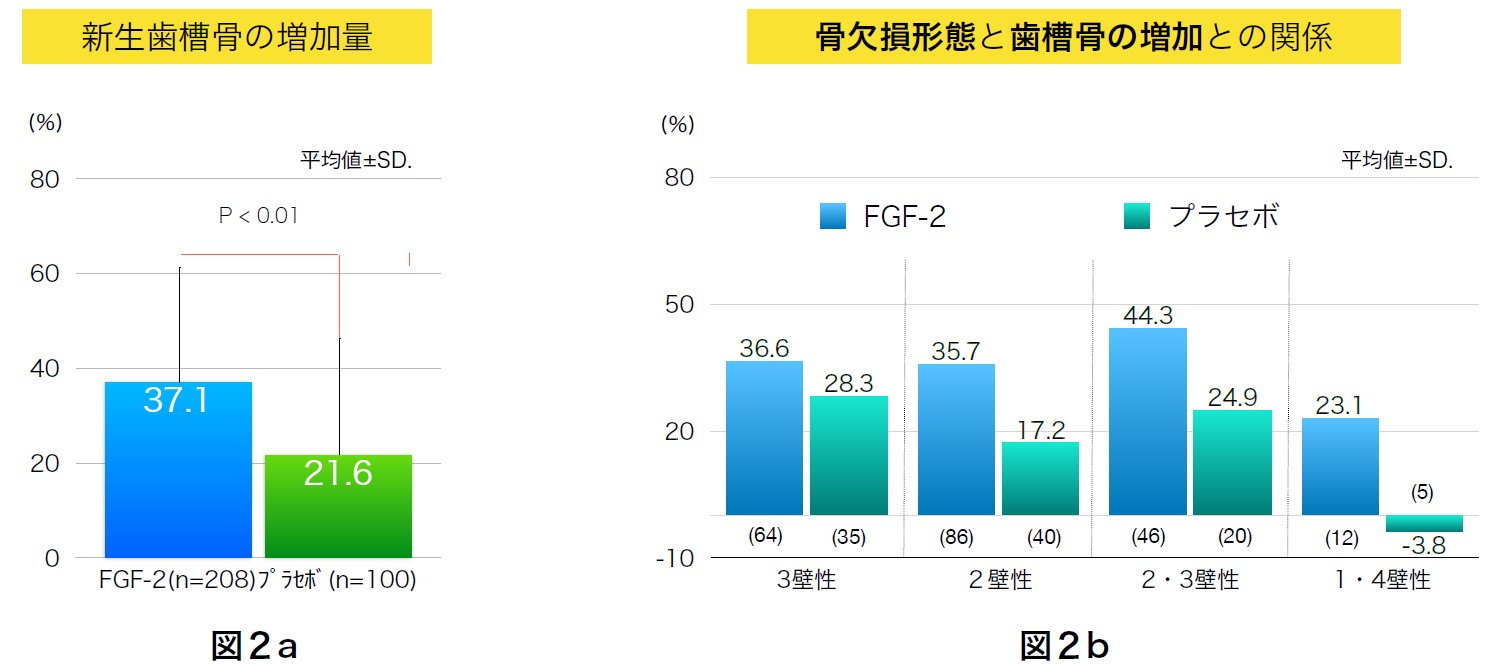リグロスを骨欠損に作用させると、早期には上皮細胞の増殖を抑制して歯根膜細胞の増殖、遊走を促進し、後期にはFGF-2が消失することで歯根膜細胞の線維芽細胞、骨芽細胞、セメント芽細胞への分化を促し、細胞外基質の産生抑制と血管新生を行い、歯周組織の再生が起こると報告されている(図3)。また、その臨床効果についても、リグロスの開発段階である第三相試験のプラセボ対照比較試験で、投与後36週のクリニカルアタッチメントレベルの獲得において両群間で有意差を認めなかったが、新生歯槽骨の増加量においてリグロス群はプラセボ群に比較して有意に増加を認めた【表2a】。また、骨欠損形態の違いによる比較では、いずれの形態においてもリグロス群はプラセボ群を上回る歯槽骨の増加量を認め、特に3壁性や2壁性でより良い臨床成績が得られたと報告されている【表2b】。
