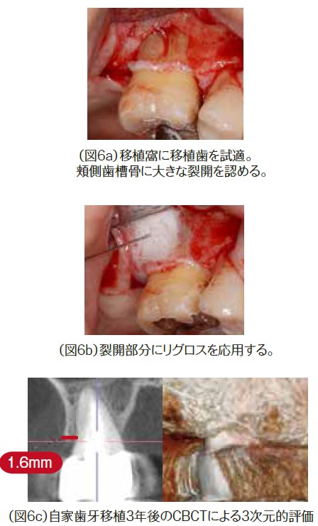 また、(図6a~c)に示すように自家歯牙移植に対しリグロスを応用したところ、移植窩に移植歯を適合させた際に頬側に歯槽骨の大きな裂開を認めたが、3年後のCBCTにて厚みのある歯槽骨の存在が確認できた。これらの臨床結果からも、硬組織誘導能の高さを感じる結果となった。