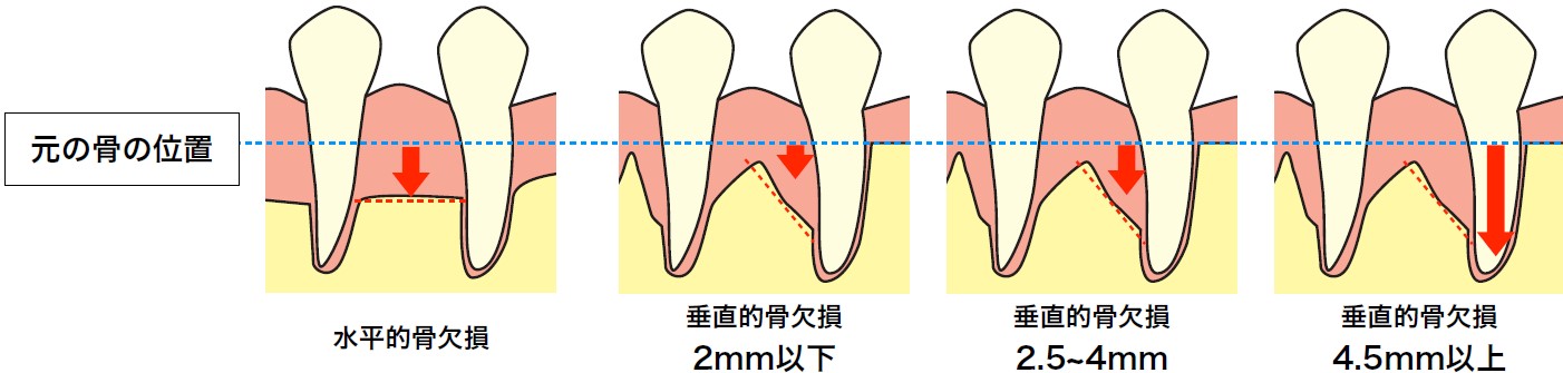 そもそも、なぜ平坦に整えられた生理的な骨形態を目指すのかについて改めて解説すると、(図1)に示すような、水平的および深さの異なる垂直的な骨欠損を有する歯に対し、系統立てた歯周治療を施さず放置した10年後の歯の喪失率を評価した研究報告がある。水平的・垂直的な骨吸収を伴う非生理的な骨形態は、歯の予後に影響を与え、特に垂直的な吸収は将来的な歯の喪失の危険因子となりうるとした。また、垂直的骨欠損の深さが深ければ深いほど、歯の喪失率が高くなり、より予後が悪くなるという結果から、歯槽骨形態を水平的にコントロールし生理的な形態に整えることの必要性を示した【表1】。